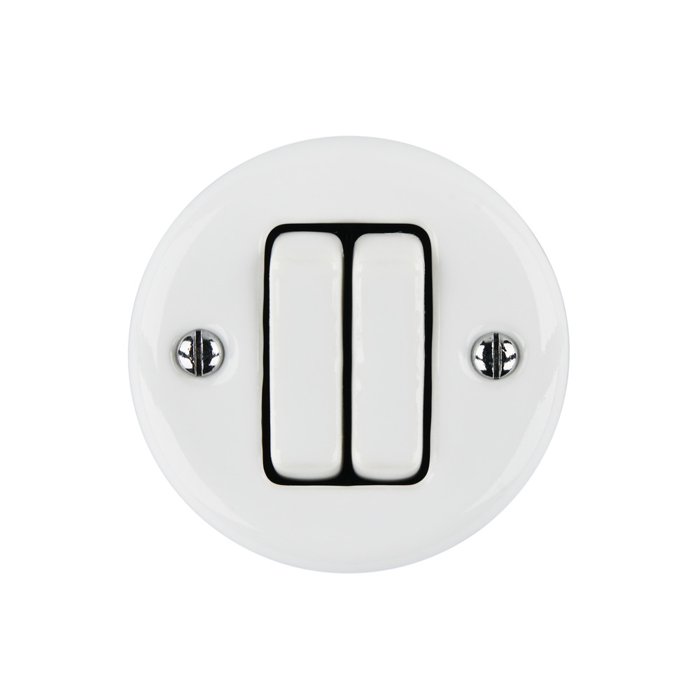 Fnd saillie bouton poussoir, double, porcelaine blanche, bornes à vis, 10A, 250V, IP20.