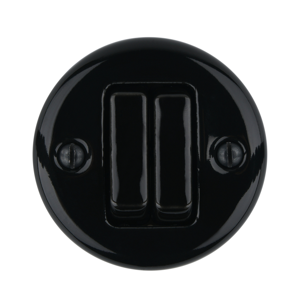 Fnd saillie bouton poussoir, double, porcelaine noire, bornes à vis, 10A, 250V, IP20.